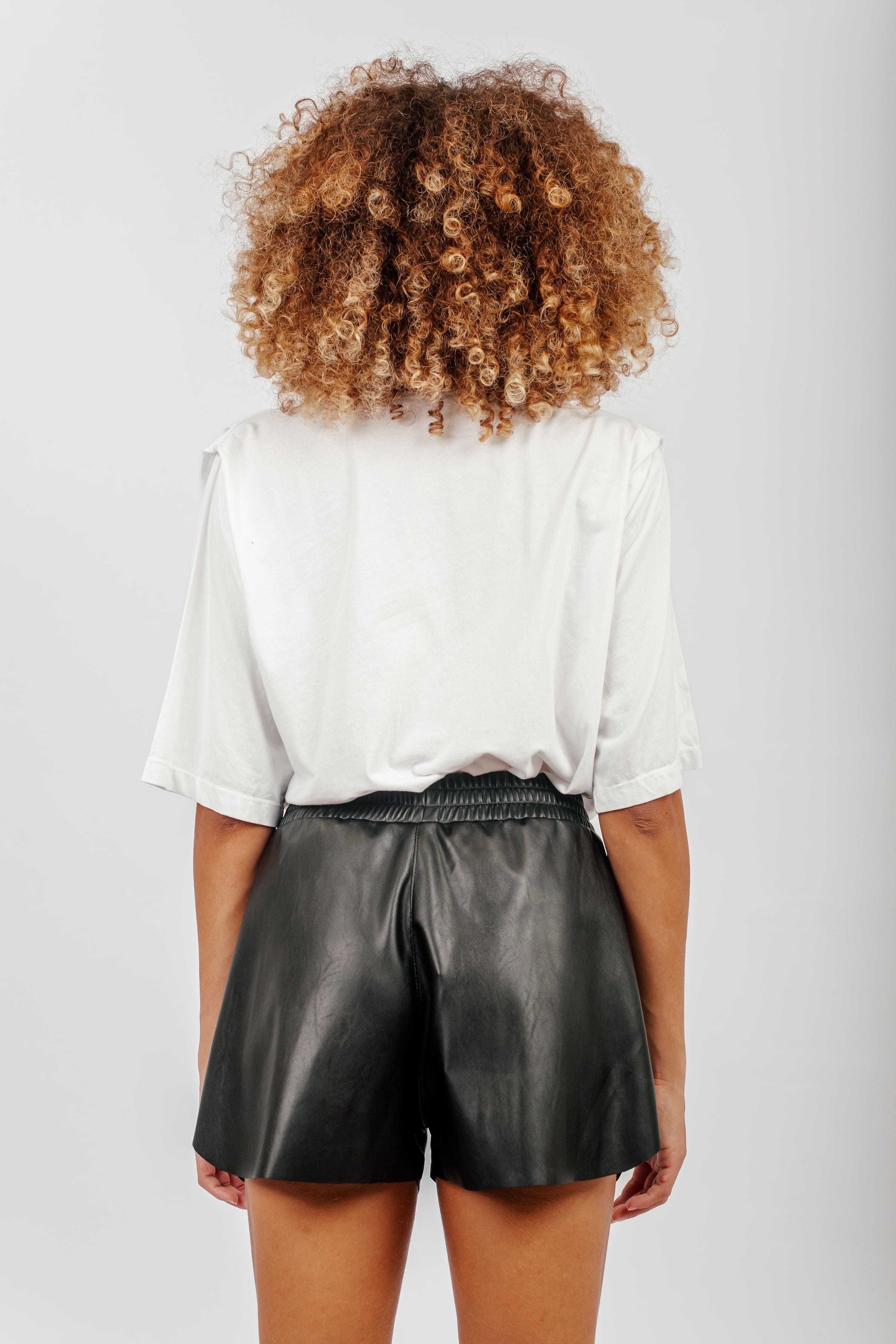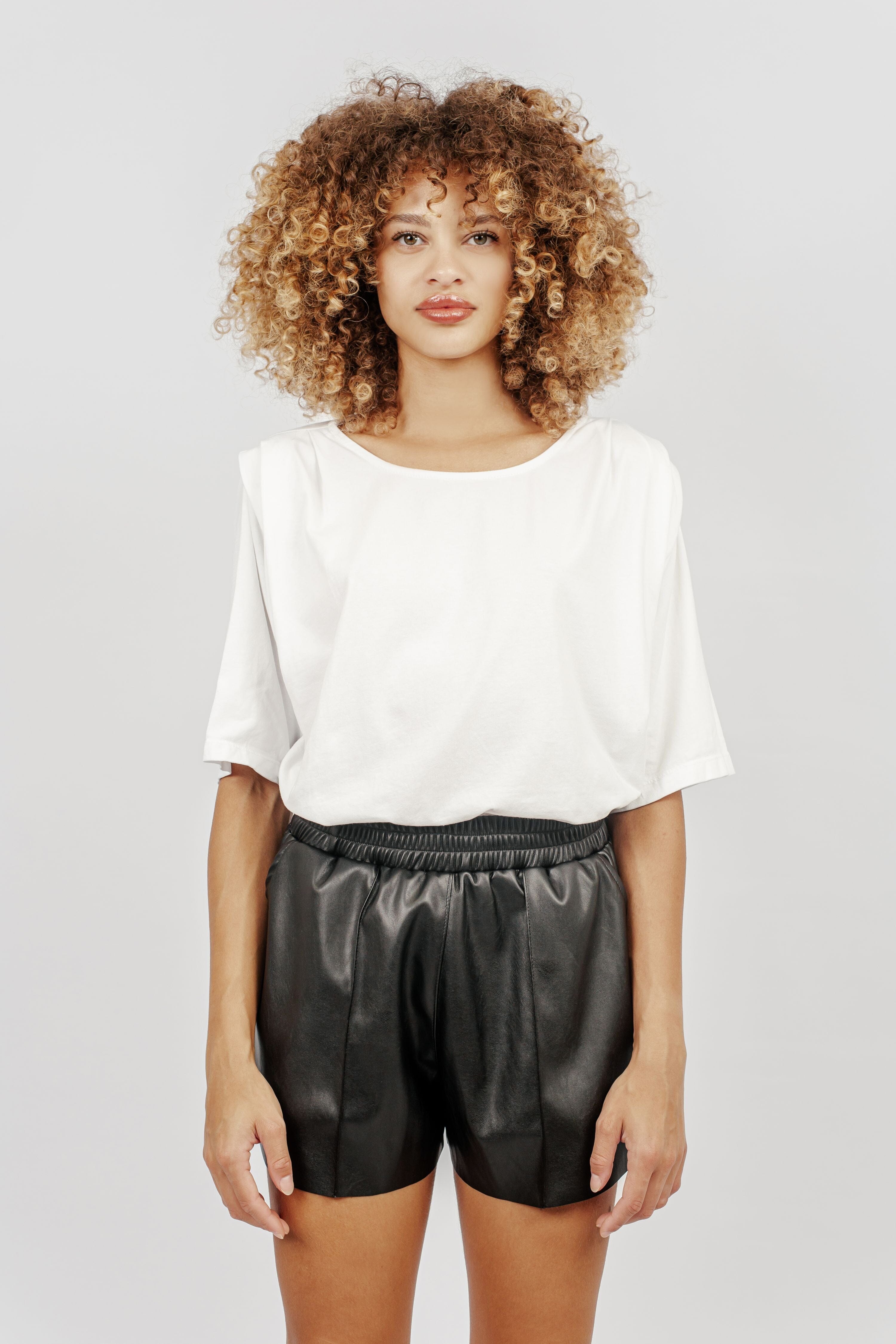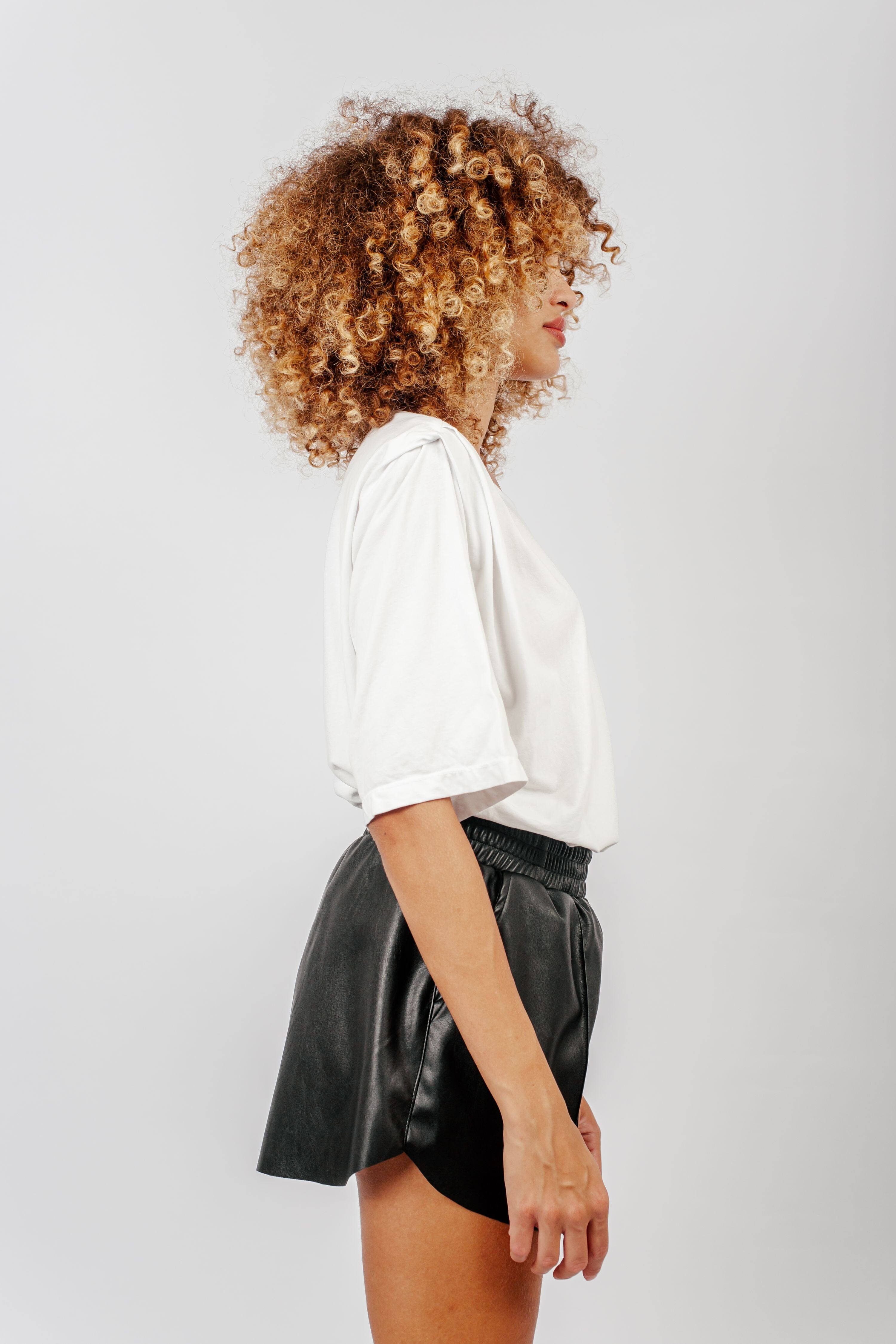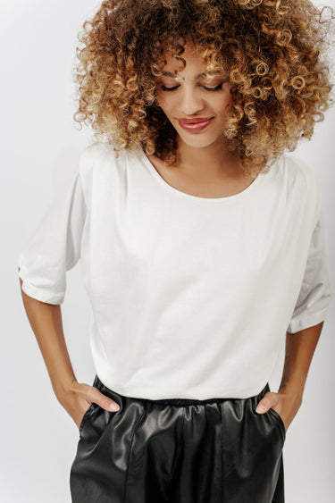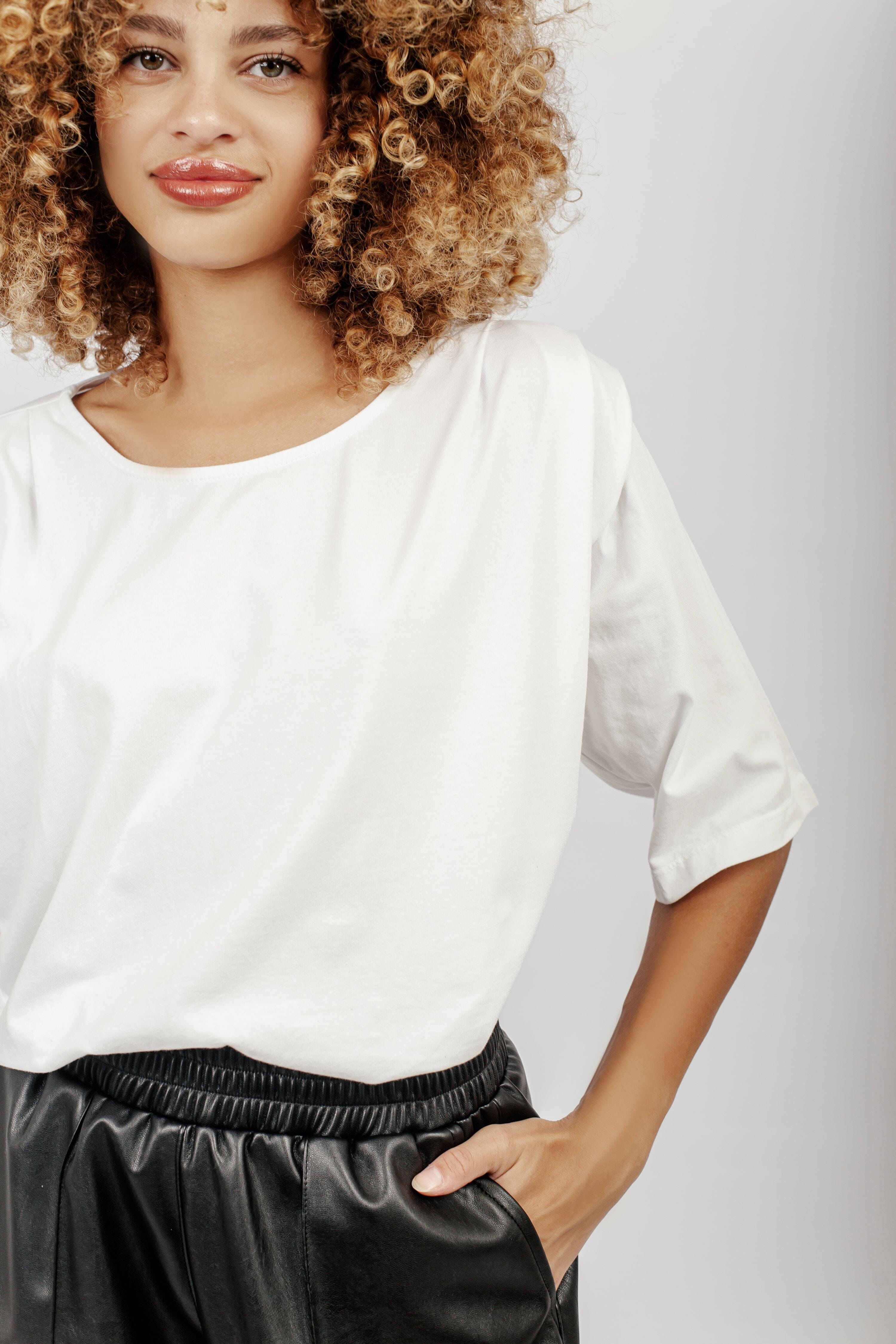 Tuffatevi nell'eleganza casual con la nostra T-shirt bianca con raffinate maniche corte. Disegnate per fermarsi al gomito, le maniche aggiungono un tocco di raffinatezza mantenendo un comfort ottimale. Questa t-shirt si distingue per le delicate arricciature su entrambi i lati dello scollo leggermente a barca, che creano un dettaglio che attira l'attenzione senza sforzo. Che si tratti di una serata in città o di un incontro informale con gli amici, questa versatile t-shirt bianca diventerà rapidamente un punto fermo del guardaroba. Con la nostra t-shirt a maniche corte e i dettagli eleganti, ogni outfit diventa una dichiarazione di stile sottile e sofisticata.